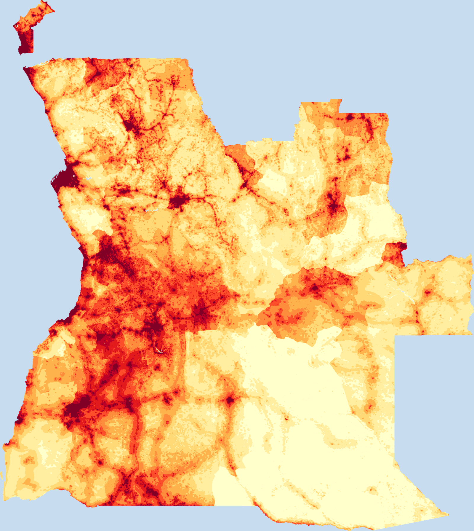 Population density map of Angola showing the distribution of people per square kilometer. View all Angola statistics →