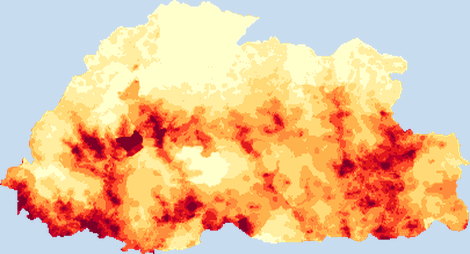 Population density map of Bhutan showing the distribution of people per square kilometer. View all Bhutan statistics →