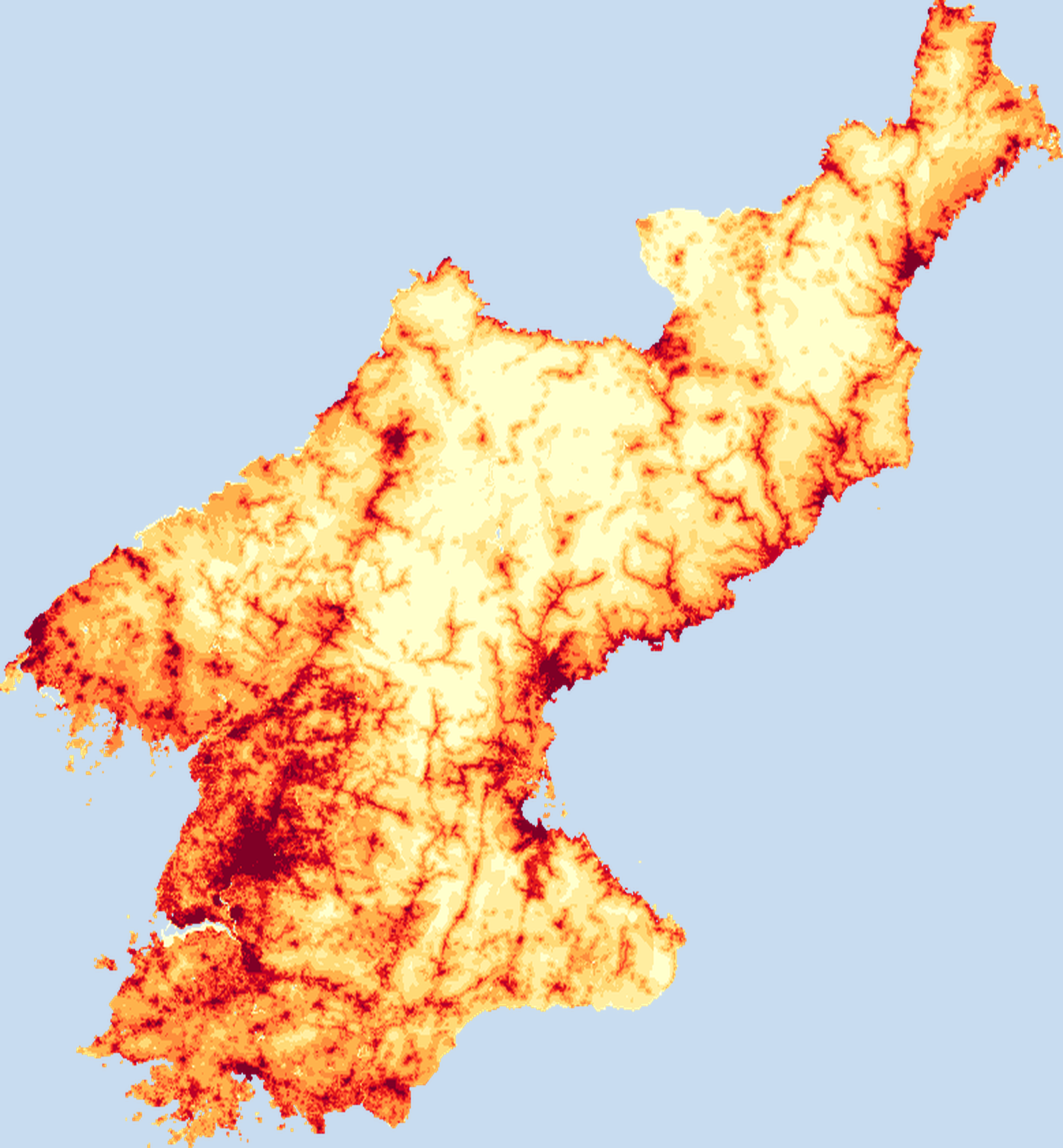 Population density map of Korea, Dem. People's Rep. showing the distribution of people per square kilometer. View all Korea, Dem. People's Rep. statistics →