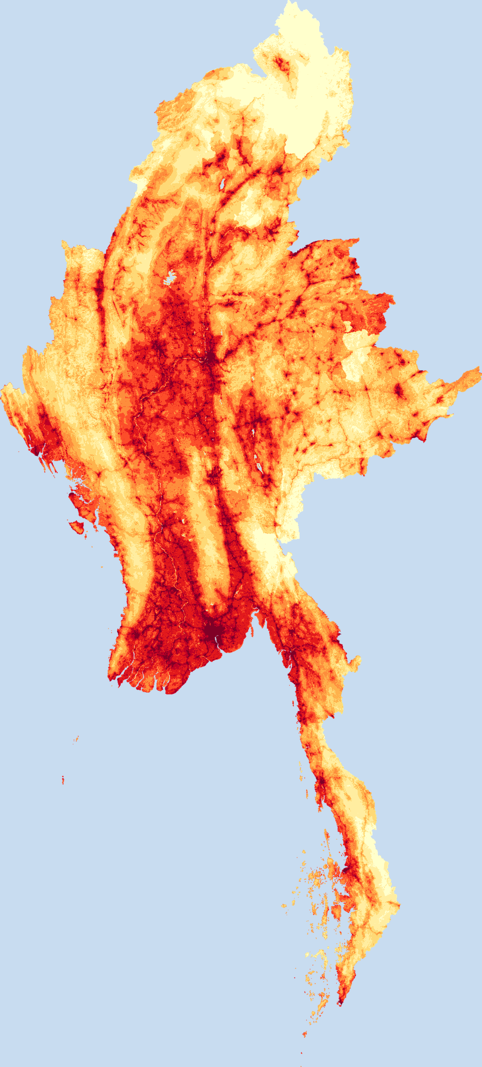 Population density map of Myanmar showing the distribution of people per square kilometer. View all Myanmar statistics →