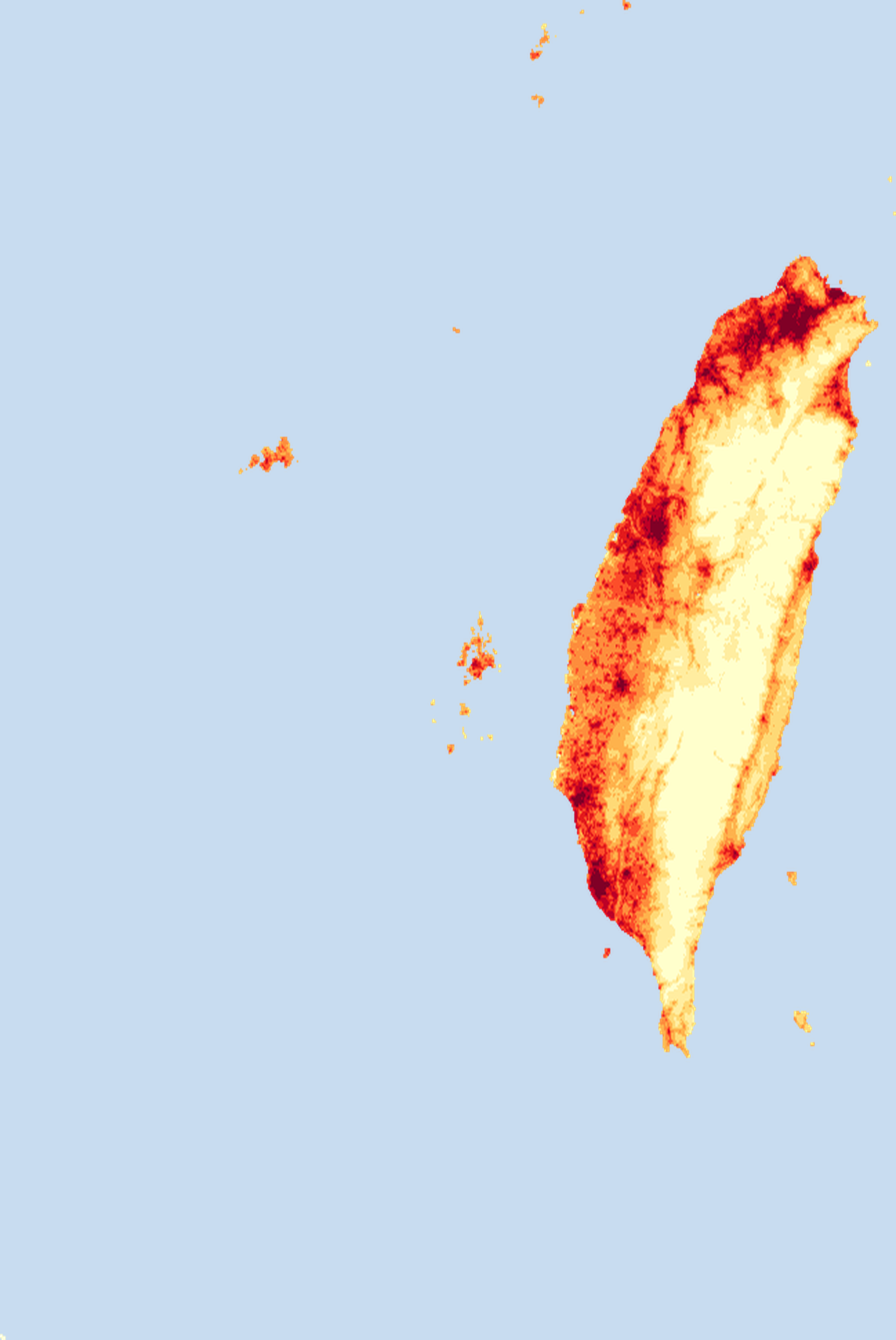 Population density map of Taiwan showing the distribution of people per square kilometer. View all Taiwan statistics →