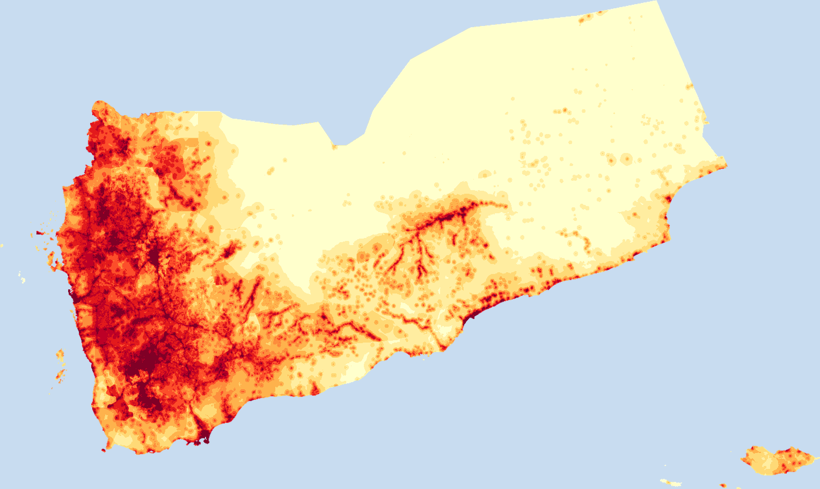 Population density map of Yemen, Rep. showing the distribution of people per square kilometer. View all Yemen, Rep. statistics →